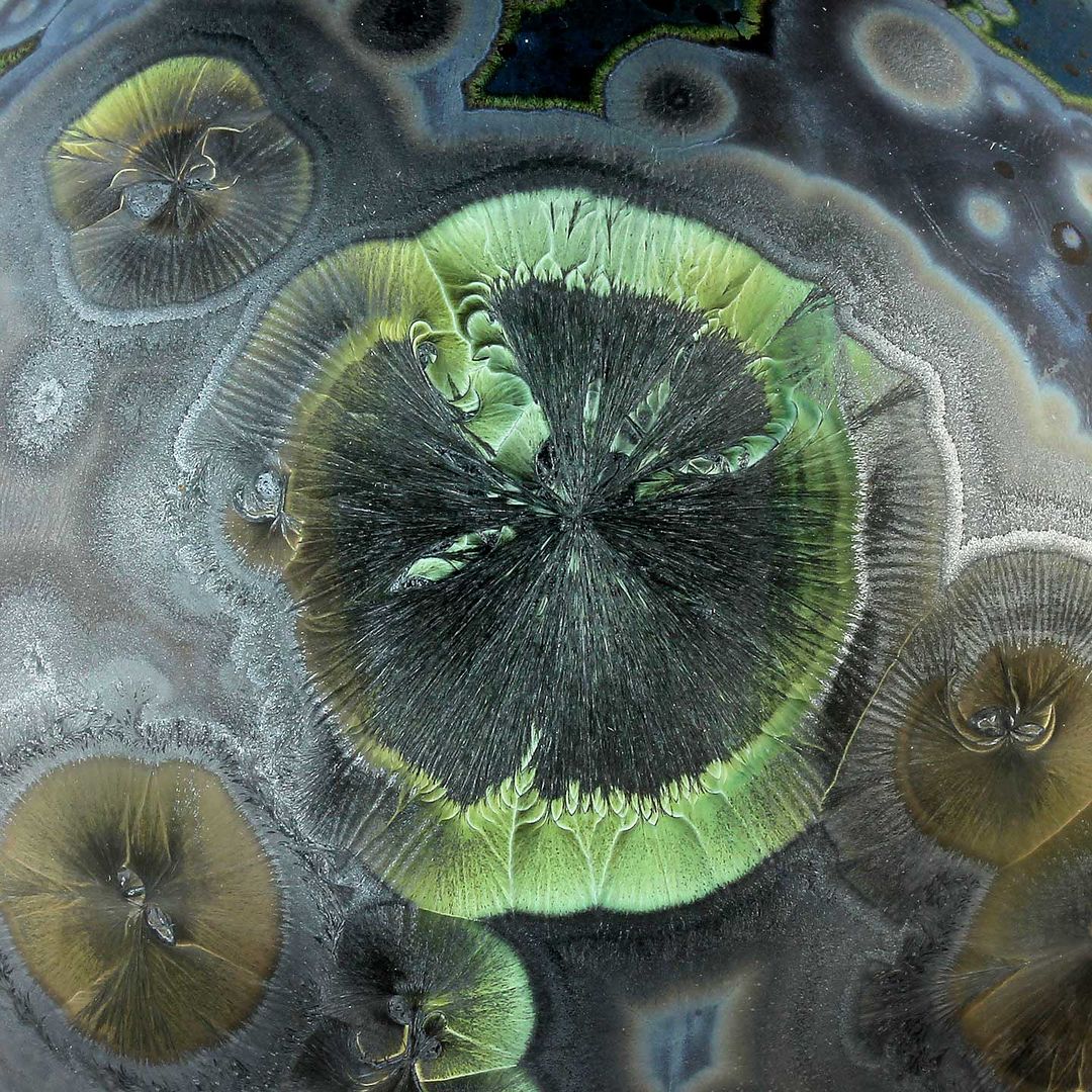 Isak Isaksson has been experimenting with crystalline glazes since the mid 1980s. His galaxy-like glazes are constantly evolving and moving boundaries for what is considered possible to achieve during ceramic firing. With a chemist’s precision and an enormous stubbornness and curiosity, Isaksson can spend years developing a specific glaze with a unique expression. The base of the glaze is a so-called frit, or glass mass, which Isaksson mixes himself or buys ready-made in powder form. Frits are prepared by melting specific elements and adding water, then drying and grinding to a fine powder. The coloring of the glaze comes from the substances mixed into the frit. There are infinite expressions within the world of crystalline glazes. Below some examples. More about the process of creating a crystalline glaze here.