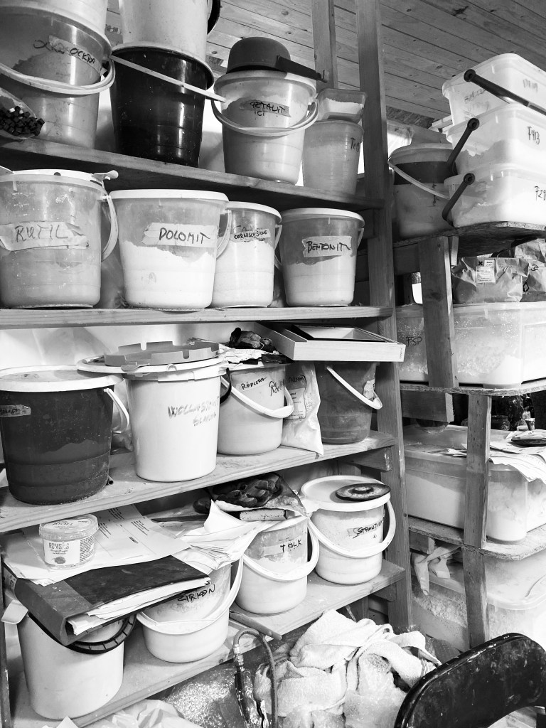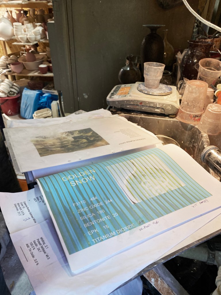 Isak Isaksson has been experimenting with crystalline glazes for almost 40 years and now has thousands of glaze recipes collected in a database. To find out how much of each substance should be included in a specific glaze mixture, Isaksson uses a glaze calculation program. “The program is static and generates very standard glazes as standard. But if I shift the balance of subjects in any direction, things happen. The program keeps track of all the substances’ atomic mass and calculates based on these,” describes Isaksson. The program is based on the atomic weight section of substances, but the actual atomic weight can vary between different refractions and geographical locations and thus lead to surprises during firing. The base of the glaze is a so-called frit, or glass mass, which Isaksson mixes himself or buys ready-made in powder form. Frits are prepared by melting specific elements in special ovens, adding water, drying and grinding to a fine powder. There are lots of developers and manufacturers of frits for, among other things, the tile and porcelain industry. Each frit has an international designation, for example “Ferro Frit 3289”. The quality of the frit has a great influence on the smoothness and regularity of the glaze and also on the color, luster and clarity.