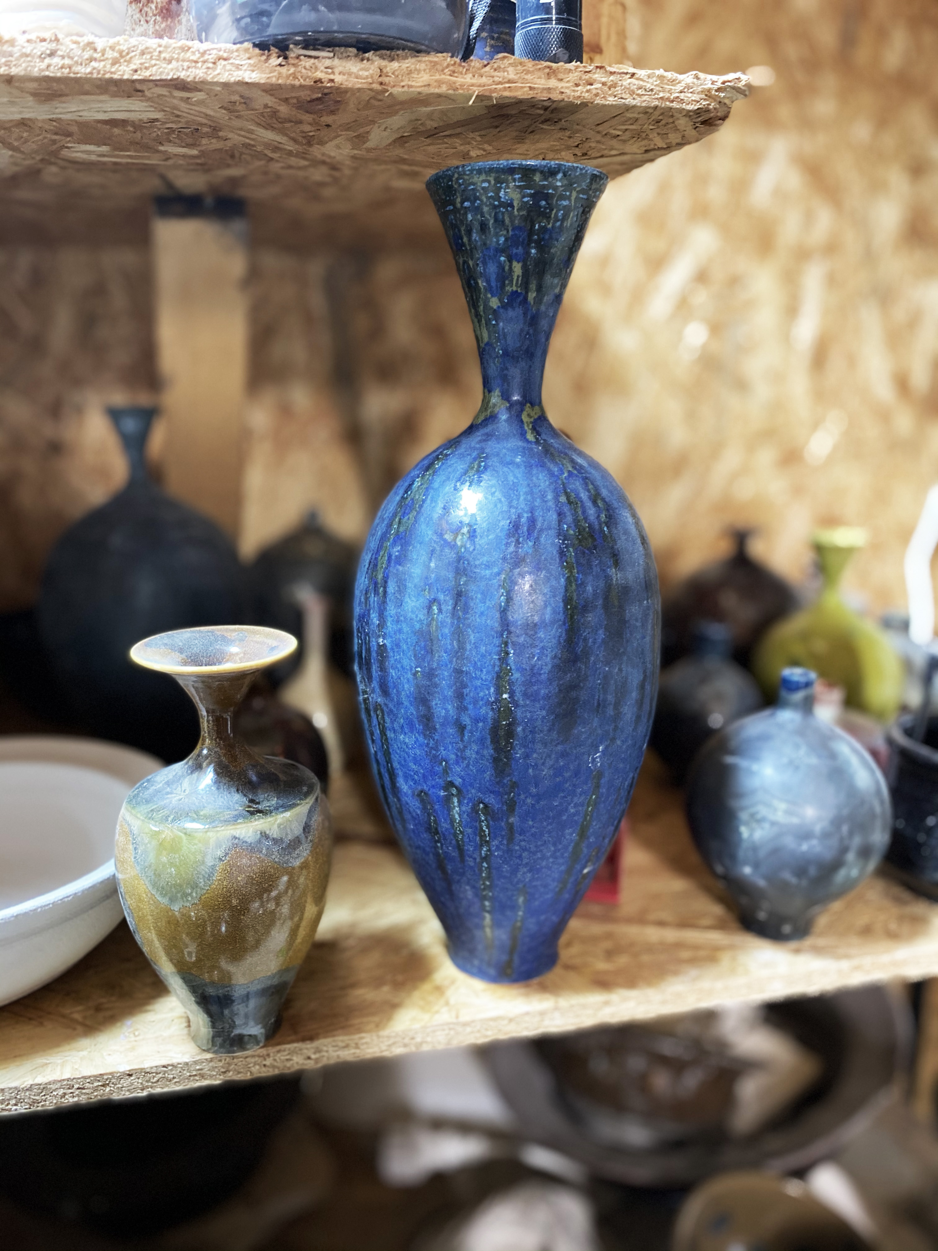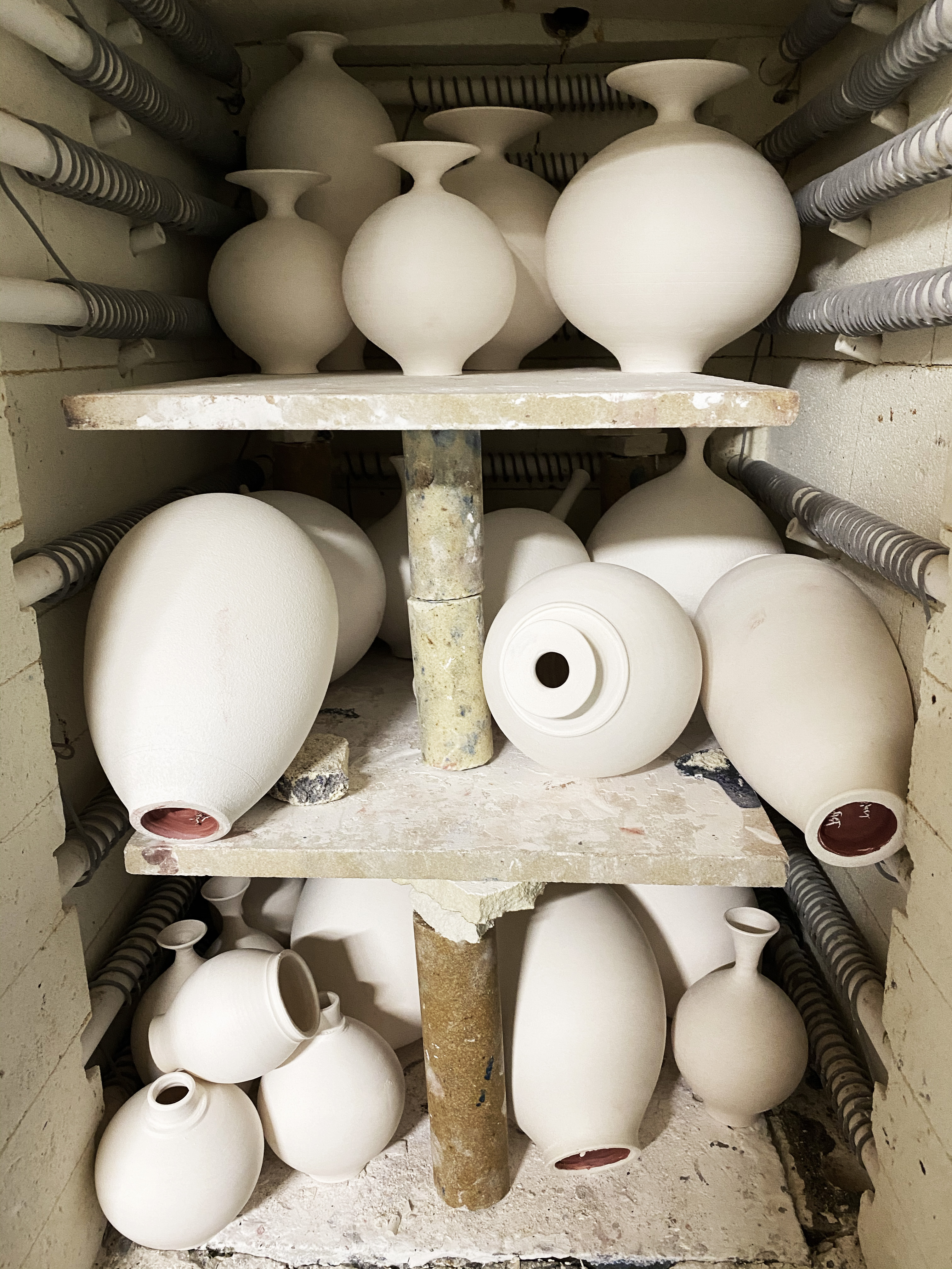 The workshop was built by Isak Isaksson when he moved to Bergshamra, north of Stockholm, in 2017. Isaksson describes the workshop as being almost an extension of himself. “Everything is connected here: the earth, nature, the house, the sun, the fire, the clay and I.” The wooden building of 45 square meters contains three large electric kilns, all designed by Isaksson himself. Outside, protected by a roof and three walls, stand a gas-fired kiln and a wood-burning kiln. Important elements in the workshop include a potter’s wheel, clays of various kinds, glaze components, water, the glaze folder, a spinning plate for photography and filming of finished works, a computer, a scale, a radio. “I listen to music when I throw. To Vivaldi’s tones, the necks of the vases become higher,” says Isaksson.
